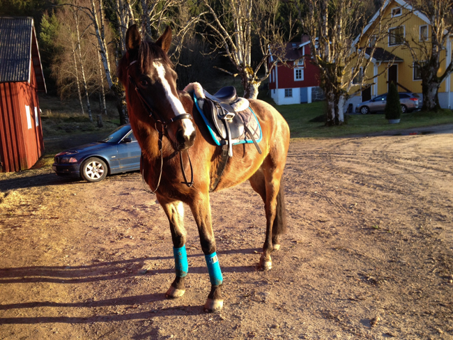 När jag var nöjd var både hästen och jag svettig, solen värmde på riktigt ordentligt där nere i sommarhagen. Jag skrittade ”långa” vägen tillbaka till stallet och Kaprifol skrittade på så fint och självsäkert så, med långa och avslappnade steg.