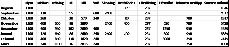 Under åtta månader har jag nu skrivit upp lite mer noggrant vad mina hästar kostar varje månad. Jag började när jag flyttade till nuvarande stallet eftersom jag tidigare betalade en fast stallhyra där ”allt” ingick medan jag nu har en mindre hyra där jag i stället köper till det som hästarna behöver.