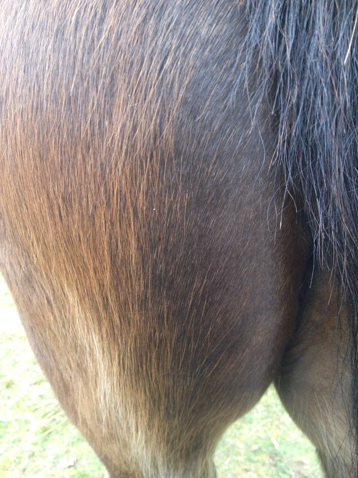 Hon kommer fortfarande vara lite ljusare vid sadelgjorden och virveln i bak, men i övrigt blir hon mörk över hela kroppen. Även benen är mörkbruna, fast de ibland ser svarta ut.