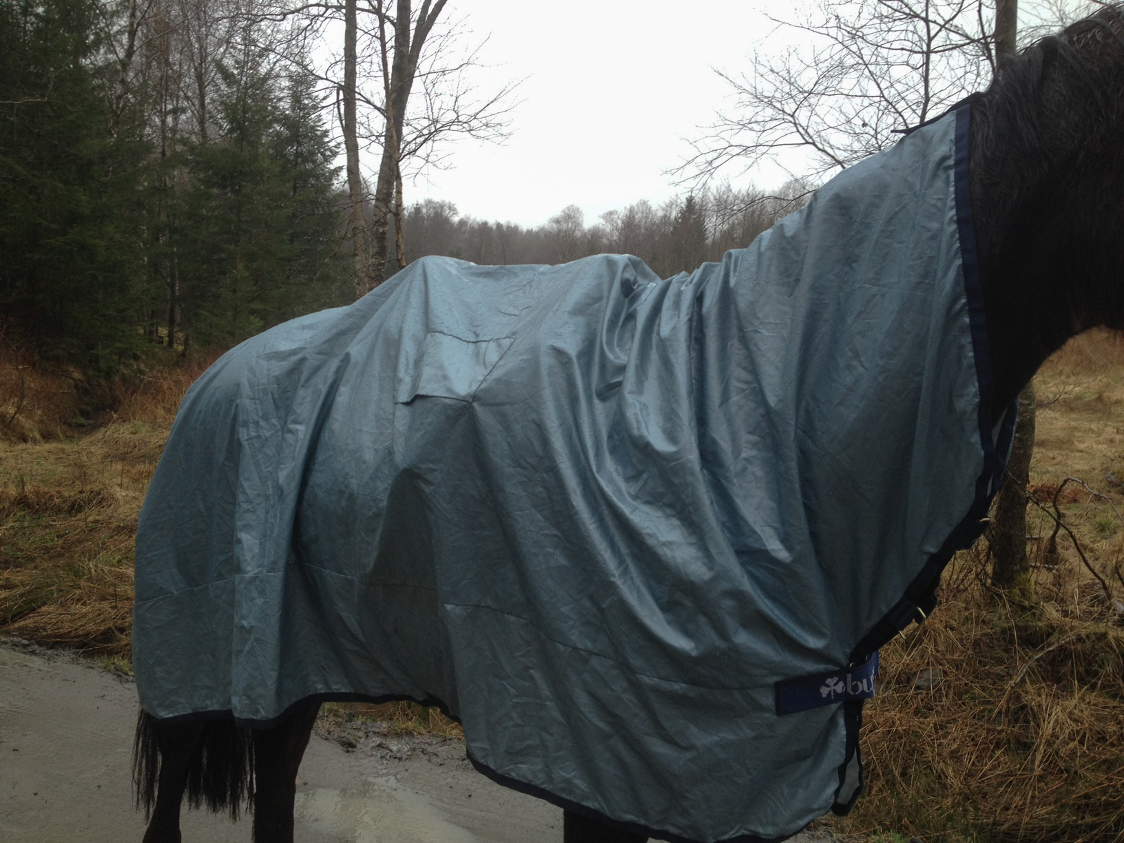 Det pölade rätt ordentligt när jag och Kaprifol gick till ridhuset idag så jag passade på att inviga ”regnrocken” som Kaprifol fått av Linda. Kaprifol var redan lite blöt så egentligen var det mest sadeln jag ville skydda mot regnet men det kändes som att Kaprifol inte misstyckte att ha den på sig.