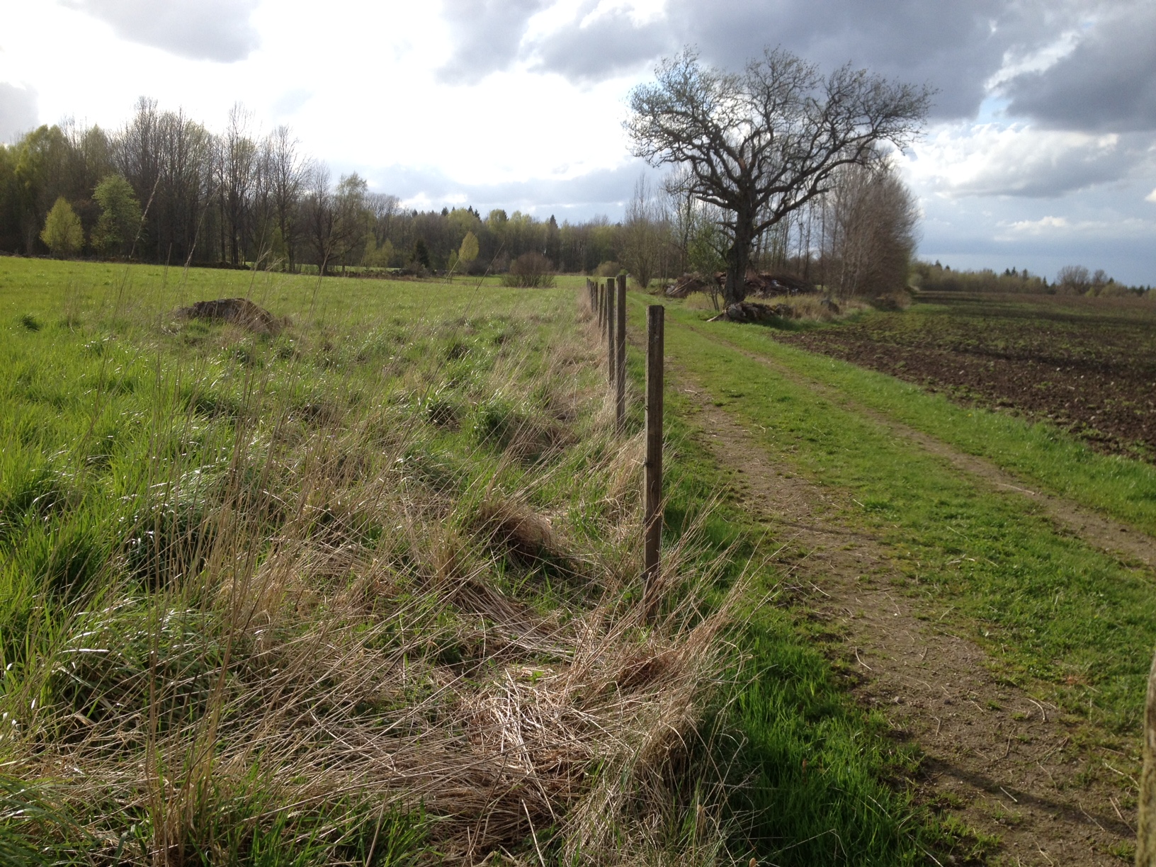 När hästarna fått komma ut i hagen igen satte jag igång med byggandet av vår andra hage. Fårstängslet försvann ju i helgen och i söndags slog vi ner de befintliga stolparna lite hårdare samt började sätta isolatorer där det fattades. Idag fortsatte jag med isolatorerna och när de tog slut började jag dra lite tråd.