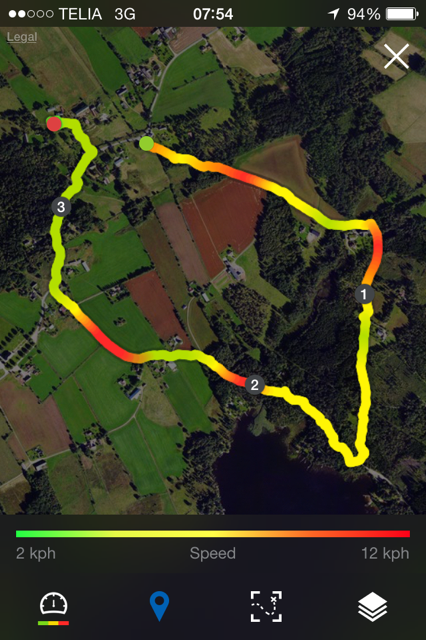 Jag har laddat hem Runtastic till mobilen igen och hade igång den under ridturen och se här blev det! Jag var lite långsam med att sätta igång den, start och mål är vid den röda pricken!