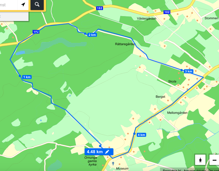 Jag glömde såklart ha på appen när jag red, men ritade upp vägen på eniro nu när jag kom hem. En runda på 4.5km blandat på skogsväg (1:a dryga kilometern), grusväg (tredje kilometern lite drygt) och asfalt (de gula vägarna). Inte alls dumt och vi fick bland annat en riktigt härlig galopp på raksträckan efter 2km-markeringen här nedan.