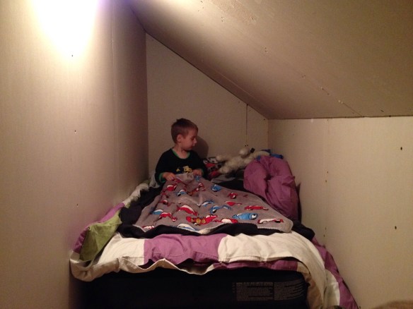 Det är kväll på gården och Lucas insisterar på att sova i ”garderoben”! Urmysigt om jag får säga det själv!
