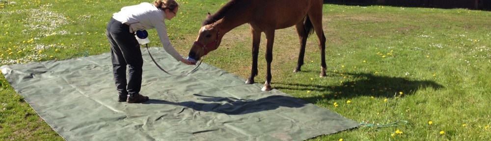 Hästarnas ”arbete” för dagen gick ut på lite enkel miljöträning: gå över och stå på en presenning. Kaprifol var först ut och efter lite borstning närmade vi oss presenningen med stora ögon och lite lätt fnysande, men när hon förstod att hon fick godis när hon satte en hov på den gröna mattan gick resten lätt som en plätt. Vi gick av och på några gånger och det var en piece of cake tyckte Kaprifol.