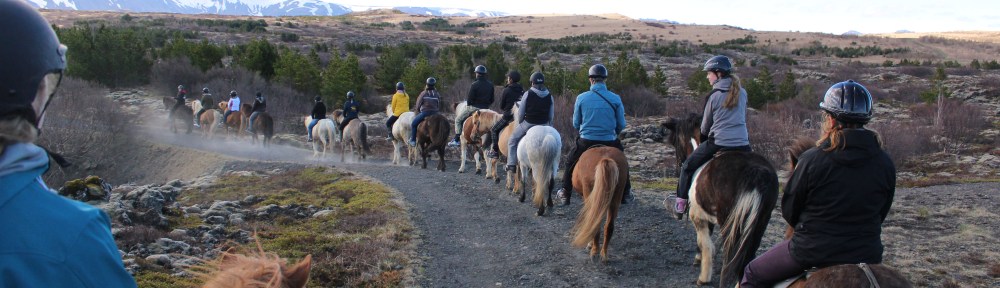 Vid niotiden i förmiddags blev vi upplockade av en minibus som körde oss en bit utanför Reykjavik till Ishestar som skulle leda vår turridning. Vi fick först se en liten film om hur man ska rida och hur man ska och inte ska bete sig uppe på hästryggen. Därefter fick vi prova ut hjälmar och sedan var det dags för hästutdelning. Här frågade de hur mycket erfaranhet man hade och när jag sa att jag hade ridit i princip hela mitt liv blev jag tilldelad en söt svartskäckig häst vars isländska namn betydde ”Without Pants.” Senare fick jag höra historian om hur det kom att bli så, men den kan jag berätta en annan gång. Without Pants var en sjuttonårig valack som tidigare varit en tävlingshäst och hade därför en mycket bra och trevlig tölt. Han sas vara ”forward” men snäll, och det var han!