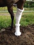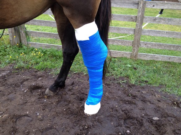 Fram till klinikbesöket (torsdag nästa vecka) ska Kaprifol hållas i stillhet och för att få ner svullnaden och hålla benet varmt och stabilt är hon bandagerad från hov till knä med två lager bomull+extra stöd runt hasen+gasbinda och därefter ytterligare två lager bomull+gasbinda och sen en vetflex utanpå allt. Hon får även Metacam (antiinflammatoriskt och smärtstillande) samt Quick fix dagligen för att hjälpa till att hålla magen på gott humör nu när hon är så pass stilla samt att Metacam inte alltid är så snäll mot magen.