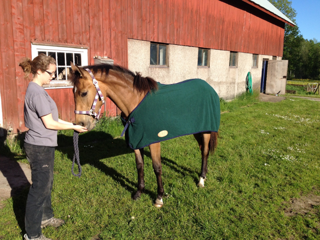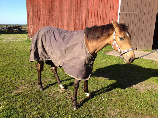 Idag har Esmée fått vara provdocka och testa två olika täcken som vi har lånat av Charm, d-ponnyn som har samma ägare som Esmée. Det händer ju ibland att det regnar en hel dag och eftersom hästarna ännu inte har sin ligghall som skydd behöver de täcke ibland. Mina två är inte så frusna av sig, men Esmée är lite mer känslig mot kallt väder och eftersom mina täcken är alldeles för stora för henne har hon nu fått låna Charms.