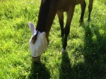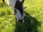 Hästarna har fått varsitt äpple och flughuva, de hade en del flugor på sig men inte så mycket andra kryp faktiskt.