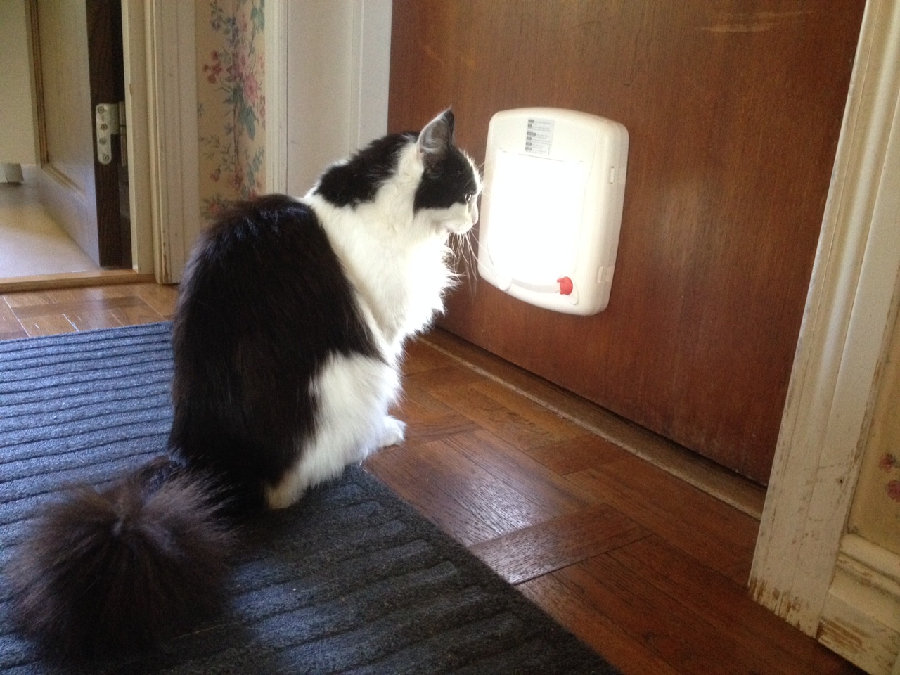 När vi kom hem från Island testade vi att stänga luckan, och Katla satte sig glatt framför luckan och bad oss att öppna hans privata dörr för honom. Då gjorde vi så att vi hade luckan halvt öppen, så att han fick känna luckan lite mot huvudet och ryggen när han går igenom, och det gick också bra. Vi gjorde luckan mindre och mindre öppen hela tiden och till sist var den bara öppen en centimeter. Här började katten faktiskt tänka lite och stack in tassen för att knuffa undan luckan, innan resten av kroppen följde efter. När han lyckats med detta ett par gånger stängde vi luckan helt. Och plötsligt hände det. Katla var ute när vi åkte hemifrån till jobbet, och när vi kom hem var han inne! Det tog ytterligare en dag innan han fattade att han kunde gå ut också, men både i går kväll och nu i morse har han försiktigt stoppat in tassen i luckan som då har öppnat sig. I morse tog det några försök innan han gick igenom, men nu när han har klarat det några gånger så vet han ju hur han ska göra!