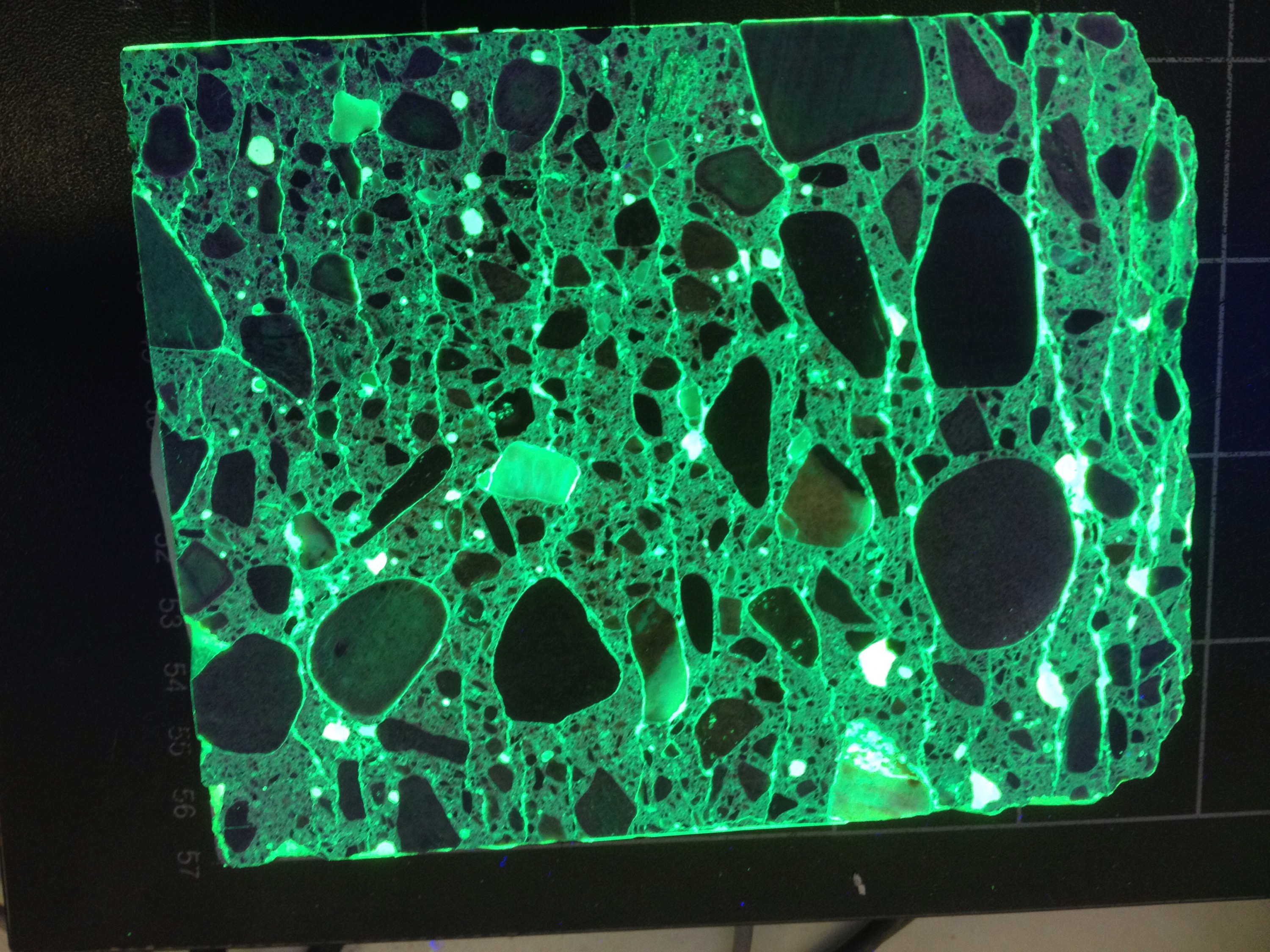 Planslip av betong i fluorescerande epoxy för att visa sprickbildning (frostskadad).