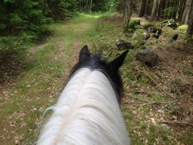 Idag kom vi upp i bra tid och lekte med barnen och fikade innan vi åkte hemåt vid tolv-ettiden. Skönt att komma hem i bra tid så man hinner greja lite hemma också! Jag började med hästarna och Kaprifol fick sig en skrittrunda. Bulan på frambenet var nästan helt borta redan igår så då gick vi en promenad bort till nya kyrkan, och idag satt jag upp och red en liten runda.