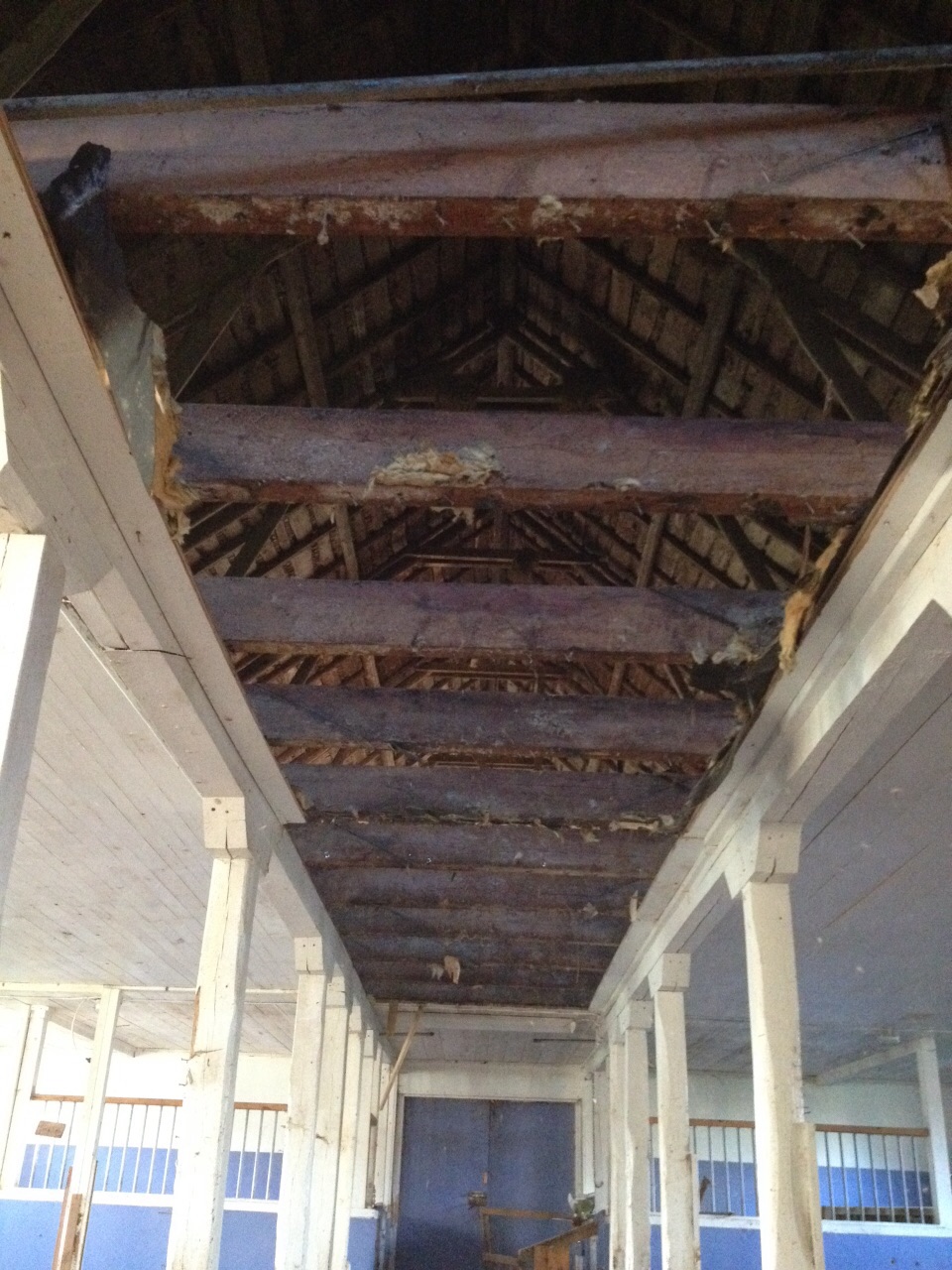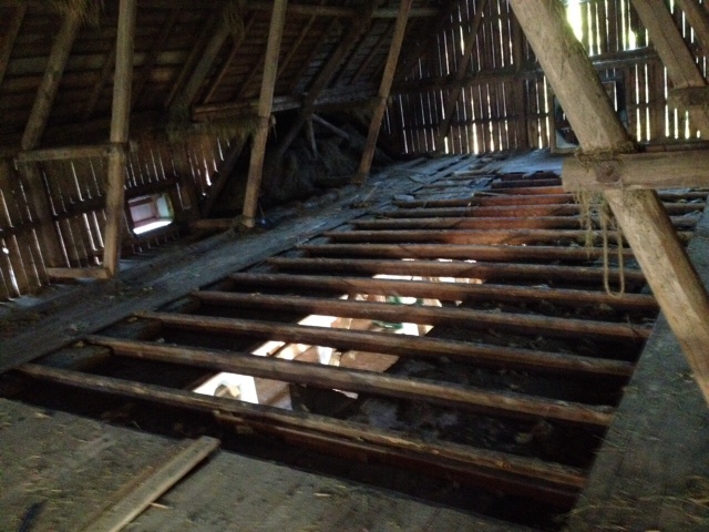 När stallet var tömt gick vi vidare till ladan där den största brädhögen finns. Jag glömde ta en före-bild, men här är vi lite mer än halvvägs ner. När vi började var brädhögen i jämnhöjd med golvet där uppe.