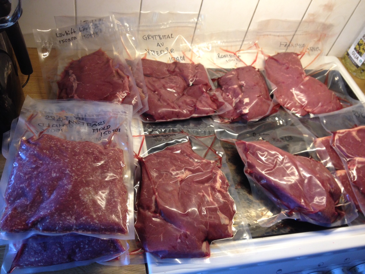 Efter att murningen blivit klar tog vi en enkel lunch och sedan åkte vi bort till Romnefall Kött för att hämta upp vår ”köttlåda” som vi beställde i förra veckan. Tio kilo nötkött från glada kossor i närheten fyller nu upp vår frys tillsammans med en himla massa bär och vinbärssaft som Axels mamma jobbat hårt med i helgen! Vi kommer nu klara vår första vinter ute på landet, det är jag helt säker på! =)