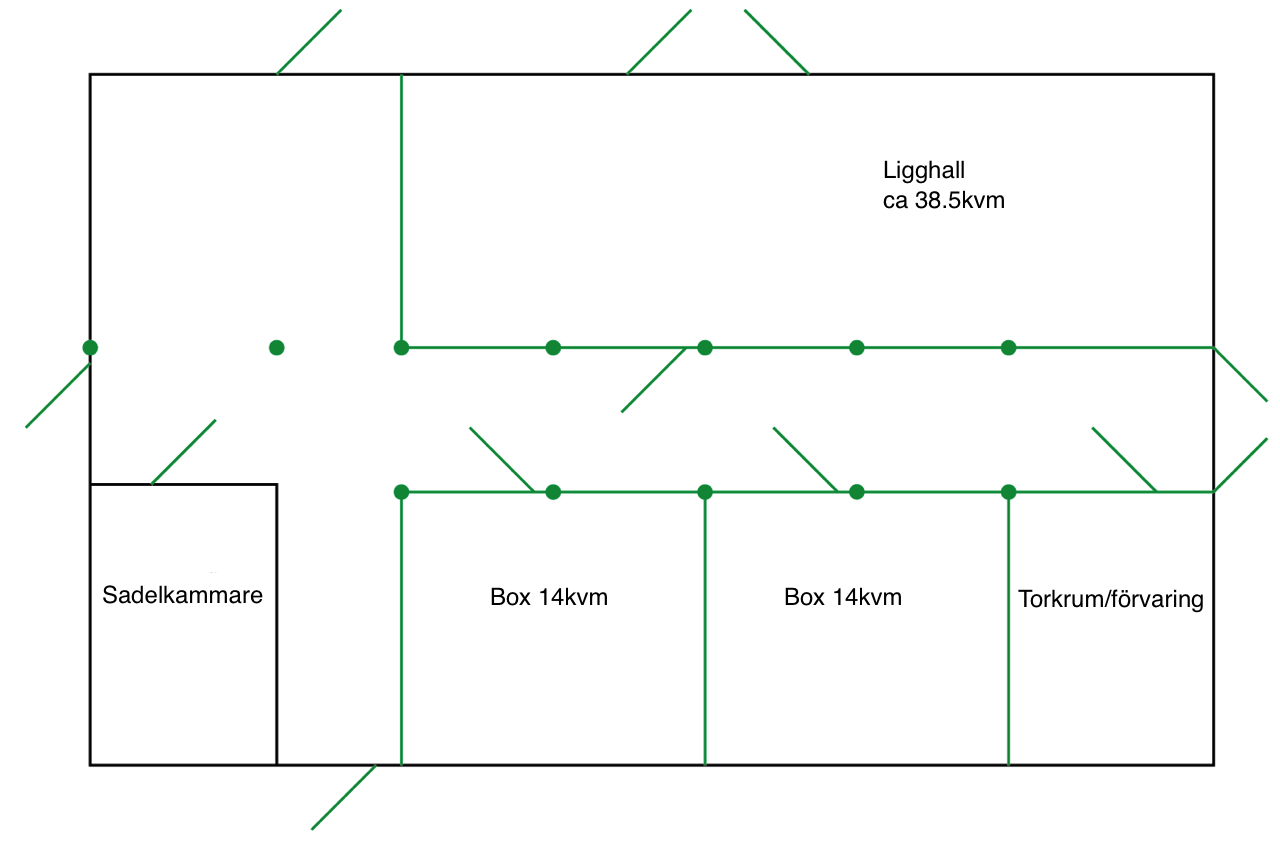 Som ni ser på ritningen här nedan blir det tolv stolpar och vi har nu gjutit elva stolpskor till de stolparna som går ända ner till golvet. Den sista stolpen, i hörnet av torkrummet, står på den gamla boxväggen så där skruvade vi fast en stolphållare i stället. Till höger i bild kommer balkarnas ändar ligga på den uppmurade väggen och sen kommer vi även mura upp väggarna till sadelkammaren så att den ena balken kan ligga där på också.