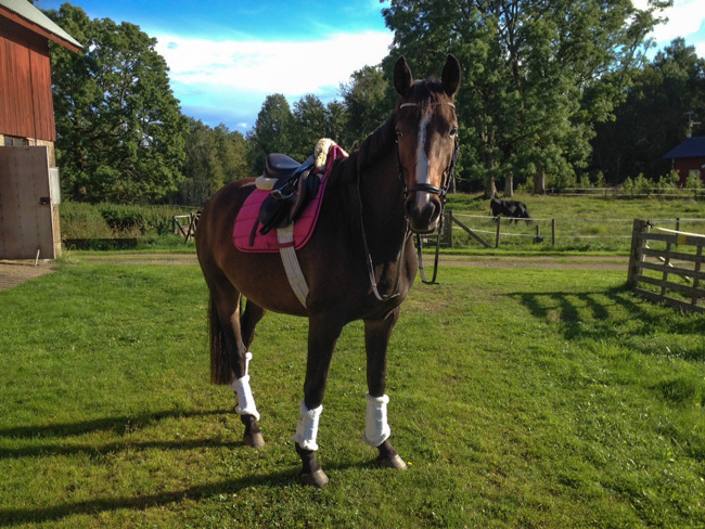 Tömkörningen igår måste ha gjort underverk för Kaprifol var toppenfin att rida idag! Jag red hemma i paddocken och trots ojämnt och lite kladdigt underlag jobbade Kaprifol riktigt stadigt och fint i traven. Jag gjorde en mängd övergångar, tempoväxlingar blandat med att hon bara fick jogga runt spåret helt avslappnat och hitta takt och balans. Hon var jättelätt och fin i munnen och det blir ju så mycket lättare att svänga när hon är avslappnad och eftergiven. Lite galopp blev det också och även om hon inte är lika fin där som i traven gör hon fina framsteg. Jag har börjat ställa lite mera krav i galoppen nu jämfört med tidigare då jag var nöjd med att galoppera några enstaka varv i lätt sits längs fyrkanten. Idag växlade jag detta med att sätta mig upp lite mer och ta nåt varv på stora mittvolten eller liknande. Inga problem alls sa Kaprifol.