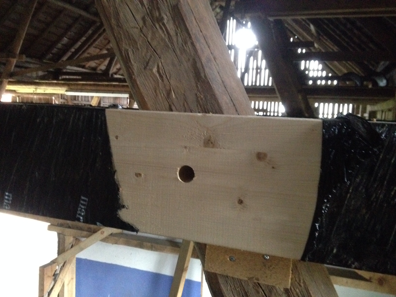 När alla takstolarna var fästa fanns det inte längre någon återvändo utan Axel drog igång motorsågen och satte den i första takstolen. Så fruktansvärt läskigt och nervöst! Ännu läskigare var det när takstolarna ”satte sig” i sin nya position. Ett dovt ljud genom hela byggnaden och det silade damm ner från taket. Hu! Alla åtta (fyra på varje sida) är nu kapade och det står kvar och känns stabilt!! 😀