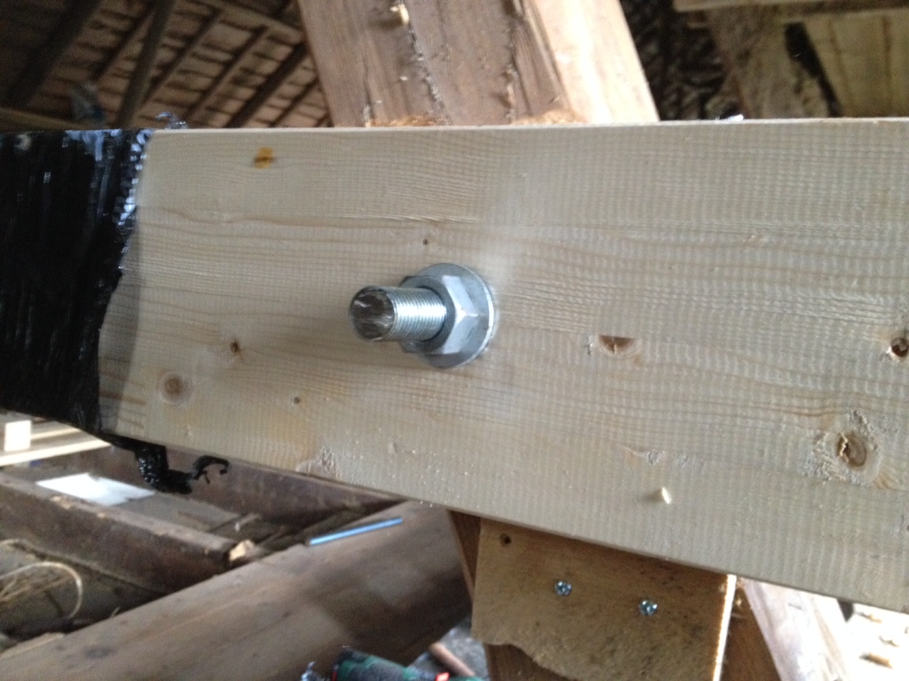 Sen har vi stuckit in stängerna i hålet och fäst med bricka och mutter: