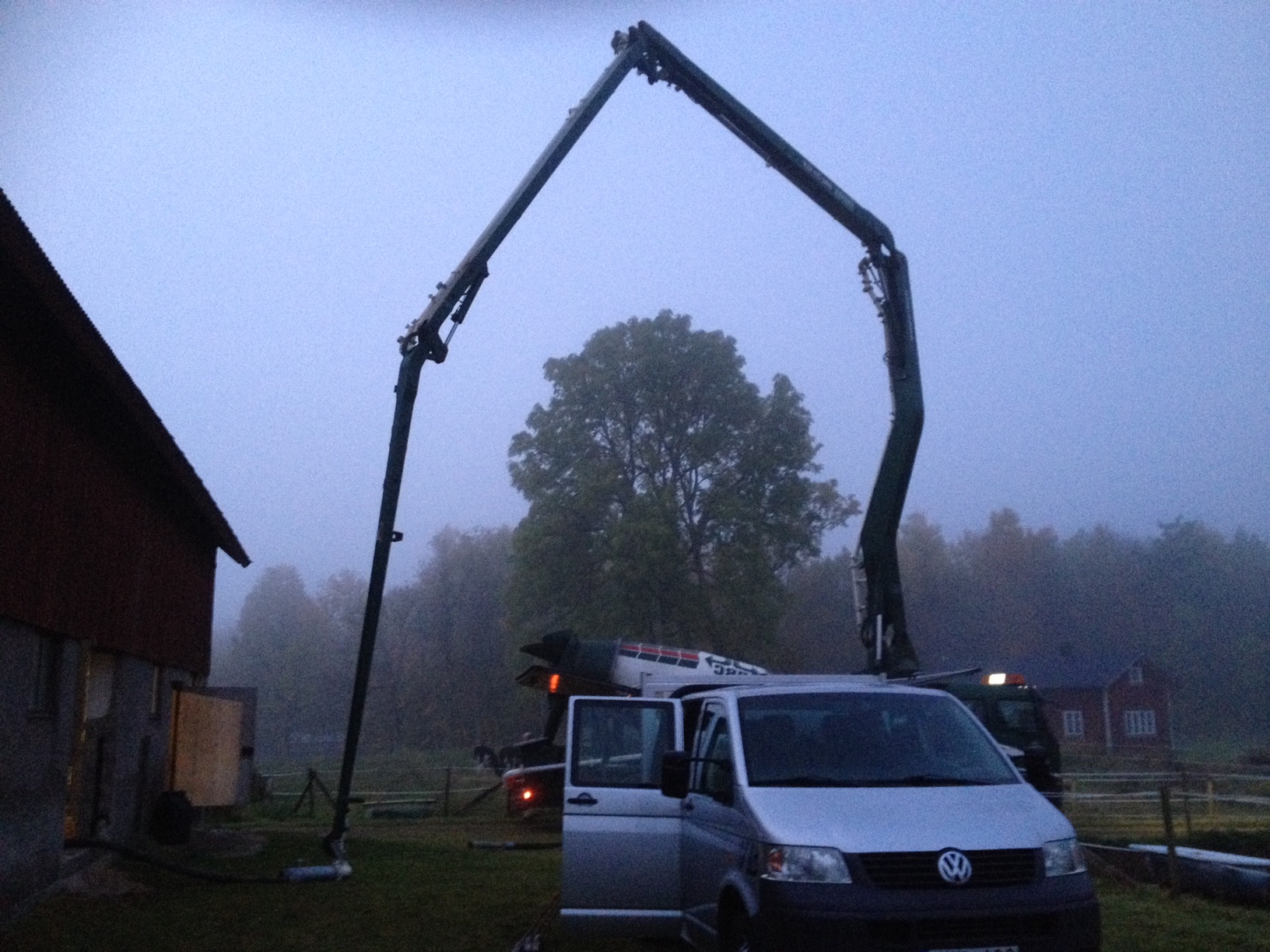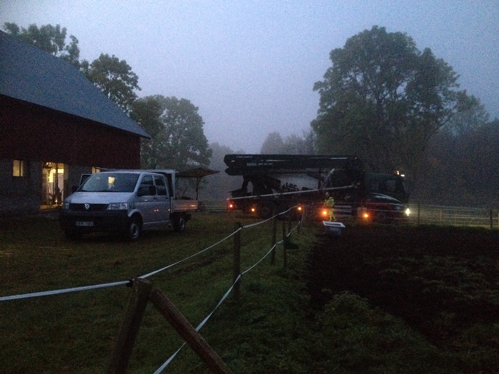 Det var inte ens ljust ute när Vårgårda Betongtjänst rullade in på gården. Redan strax efter sju var de här och förberedde med att plasta in väggar och annat. Inte många minuter därefter kom pumpbilen och sen kom första betongbilen. Så häftigt! Jag har gått runt här på morgonen med ett fånigt leende på läpparna.