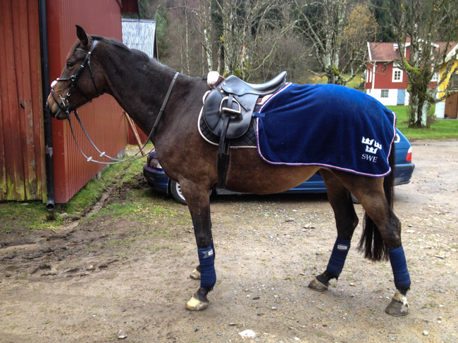 Kaprifol är nu på väg igång igen efter en välförtjänt vilovecka. I söndags skrittades hon ut i skogen och igår fick hon jogga lite på lina på ridbanan. Hon såg fräsch ut och busade lite i galoppen men höll sig ganska bra på mattan. Hon fick röra sig lite i alla gångarter samt trava över ett par bommar några gånger.