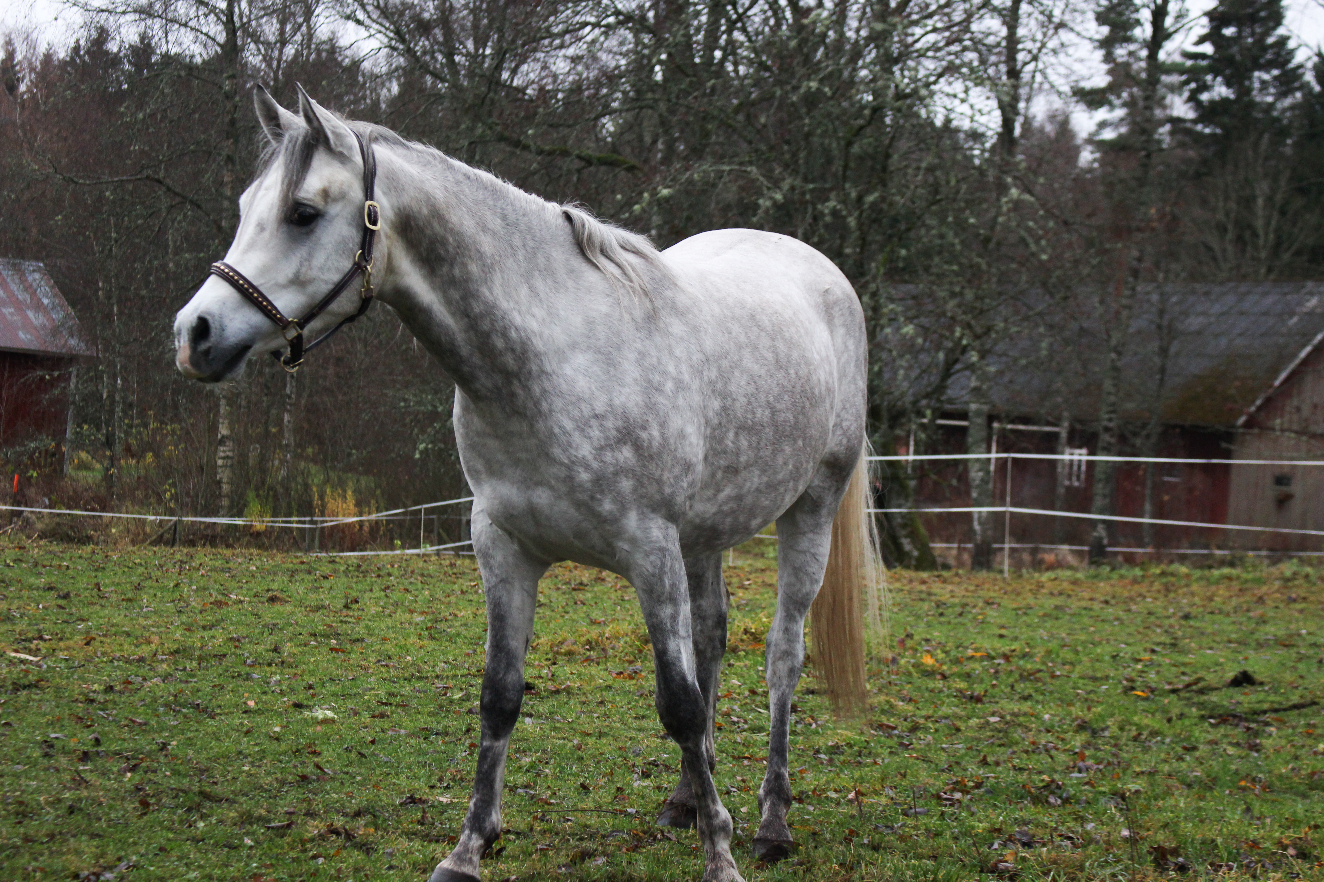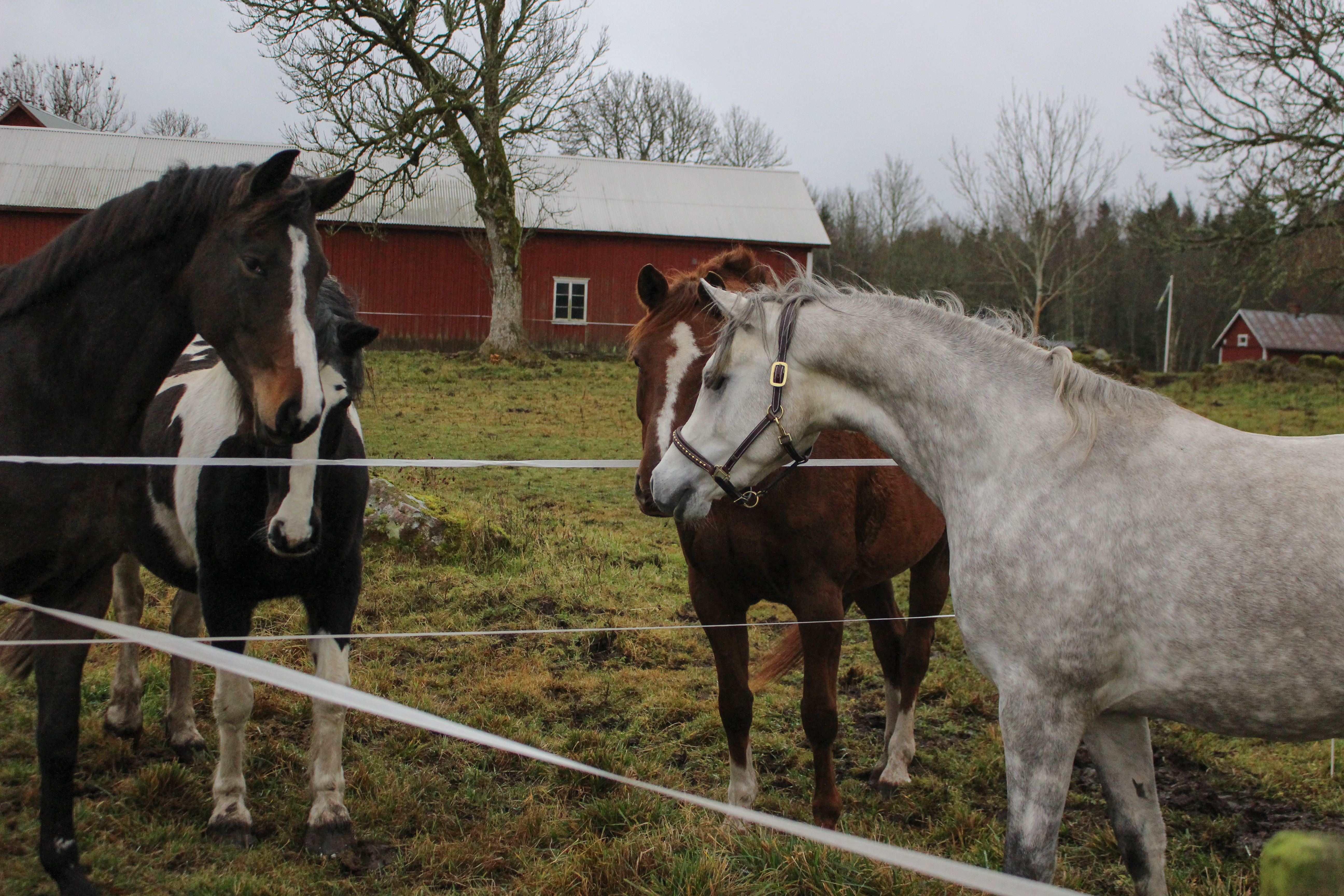 Inte så länge efter att vi var klara med hästarna efter ridturen rullade transporten in på gården med en nykomling lastad. Wadis, en arabvalack på 2.5 år, fick komma in på ridbanan först och få resan ur benen, hälsa på tjejerna över staketet och känna in atmosfären lite innan han blev utsläppt i stora hagen. Jag föredrar att nya hästar går i egen hage ett par dagar innan ett ihopsläpp, men eftersom vi inte har några boxar ännu och bara en lösdrift hade ju nykomlingen isåfall fått gå utan något skydd alls även nattetid, och det känns ju lite taskigt. Därför släpptes han in ganska direkt.