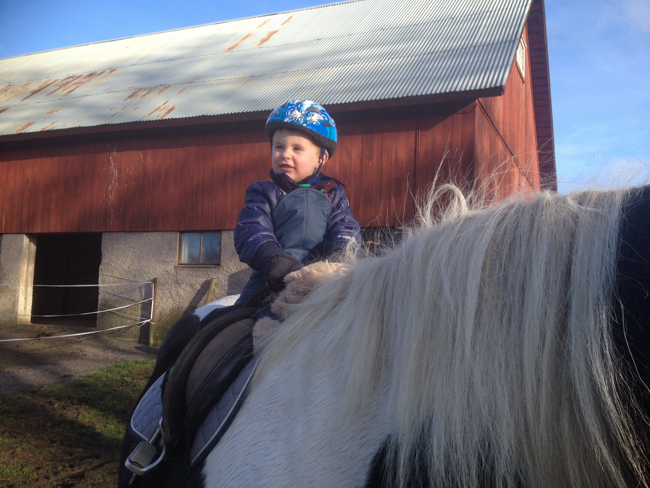 Ett par timmar senare kom Susanne och barnen och hälsade på! Vi började med fika och gick sen ut i stallet där Alice blev borstad. Sen gick vi en runda i skogen och Lucas och Oliver turades om att rida. Alice var pigg, lite extra pigg på hemvägen såklart, kärlekskrank och brunstig som hon är… Ston!