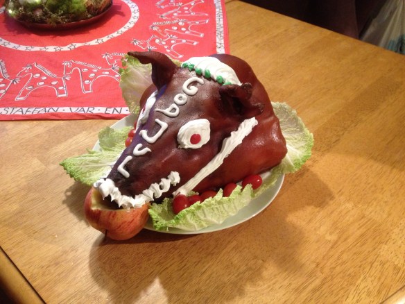 En annan liten rolig detalj på vårt julbord i år blev grishuvudet som vi sparat från den hela grisen vi köpte och helgrillade i somras. Lite osmakligt med ett huvud kanske, men inte ska man låta det köttet förfaras. Den vanliga julskinkan var dock mycket godare tycker jag 🙂