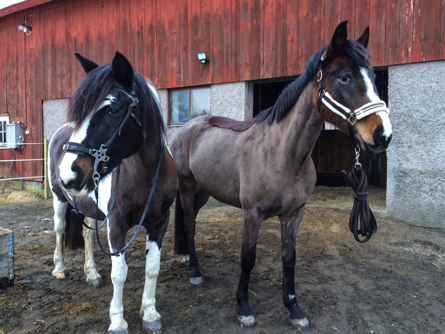 Det är himla mysigt att vara ute i skogen med båda hästarna samtidigt! Igår red jag Alice barbacka och hade Kaprifol i lina och de var pigga och spralliga båda två. Kaprifol vilade ju i onsdags när jag var på brandutbildning så planen för igår var att låta henne rasta sig lite lös. Vi värmde upp på skogsvägen bakom gården i skritt och trav och sen red jag ut på gärdet och knäppte loss bushästen.