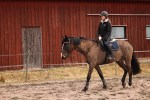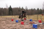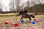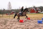 Rebecka hängde med mig och Kaprifol till paddocken idag och vi tog fram några studshinder till dagens hoppövning. Kaprifol har inte hoppat studs innan, så vi började fyra galoppbommar och sen la vi upp ett hinder i taget så hon fick känna att det var enkelt och roligt. Och det tyckte hon! Vi la upp alla fyra studsen till sist och vi studsade över dem okomplicerat åt båda hållen ett par gånger. Det gick lite snabbt ibland, men så var det ju ganska lågt också. Nästa gång vi ”studsar” kan vi nog göra dem lite högre så hon får tänka lite mera.