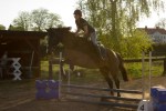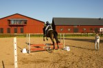 När det var min tur gick vi in på utebanan där fem hinder stod uppställda i en superenkel bana, ni vet, långsida-snett igenom -långsida- snett igenom, och presenterade oss kort för tränaren. Vi fick hoppa fram på ett hinder, som Kaprifol inte ens kunde gå fram till för hinderskjulet precis bredvid var SÅÅ OTÄCKT! 😛 Men det gick snart bra och efter två språng på detta hindret och ett språng på ett annat fick vi hoppa banan som bestod av sju språng. Jag hade lite undertempo och fick inte riktigt till avstånden helt så det blev lite vingligt och ojämnt, men Kaprifol hoppade fint och var med på vilket håll vi skulle åt. Tränaren var riktigt tråkig och kom inte alls med någon direkt feed-back som jag hade hoppats på.