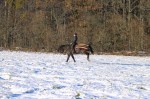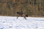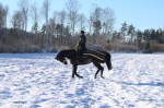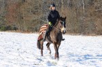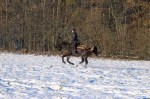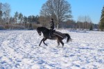 Det var ju en heldag med hästar igår, som jag nämnde, och det började med att Camilla kom hem till mig och följde med ut på gärdet och fotade när jag red Kaprifol. Det var ett strålande väder och Kaprifol visade sig från sin mest energiska sida. Hon taggade redan lite i stallet när Axel drog ur släpet ur ladan, och så fort jag satt upp så kände jag att hon var rätt laddad så att säga. Det blev ju heller inte bättre av att vi var ensamma ute på ett stort snötäckt gärde och snön föll från träden och det knastrade lite från skogen runtomkring, men hon var ändå relativt fin att rida. Det blir ju dock mest att jag får rida runt och bromsa i sådana lägen, men det blev ändå många fina bilder! Jag tänkte jag skulle börja att visa er ”busbilderna”, jag tror ni kommer känna in hennes sinnesstämning från de här bilderna!