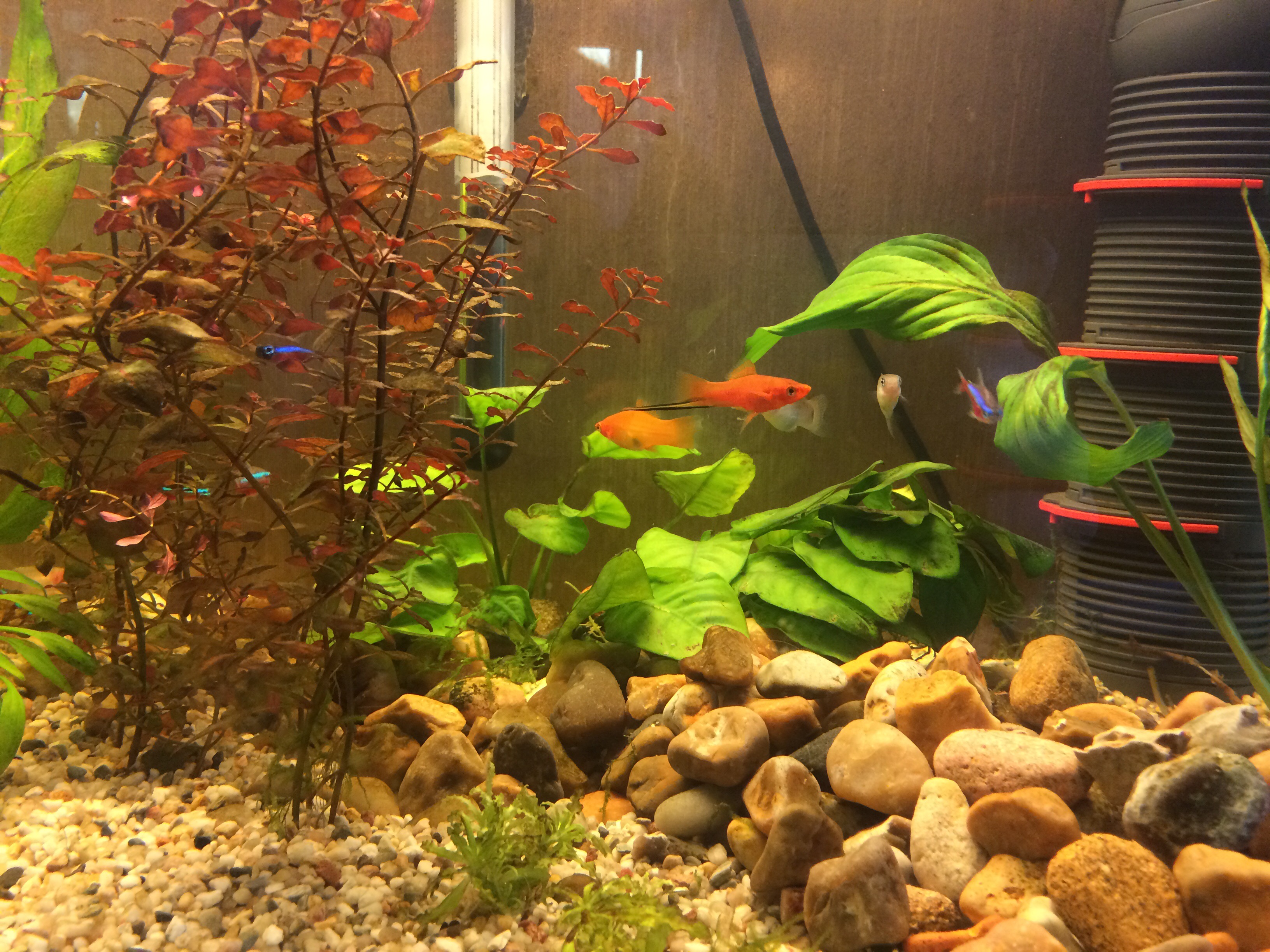 Jag lät Axel stanna vid en fiskaffär på väg hem från jobbet igår och han kom hem med ett helt gäng (orangea!) firrar. Så förutom de fiskar vi hade sen tidigare (2 platy, 6 tetror, 3 rödhuvuden, 2 räkor) har vi nu ytterligare 2 platys (vi hade två hanar och Axel köpte två honor), 4 guppysar, 3 svärdbärare och 2 algätare.
