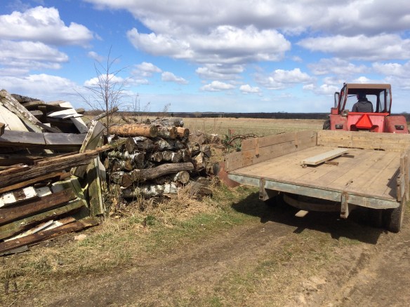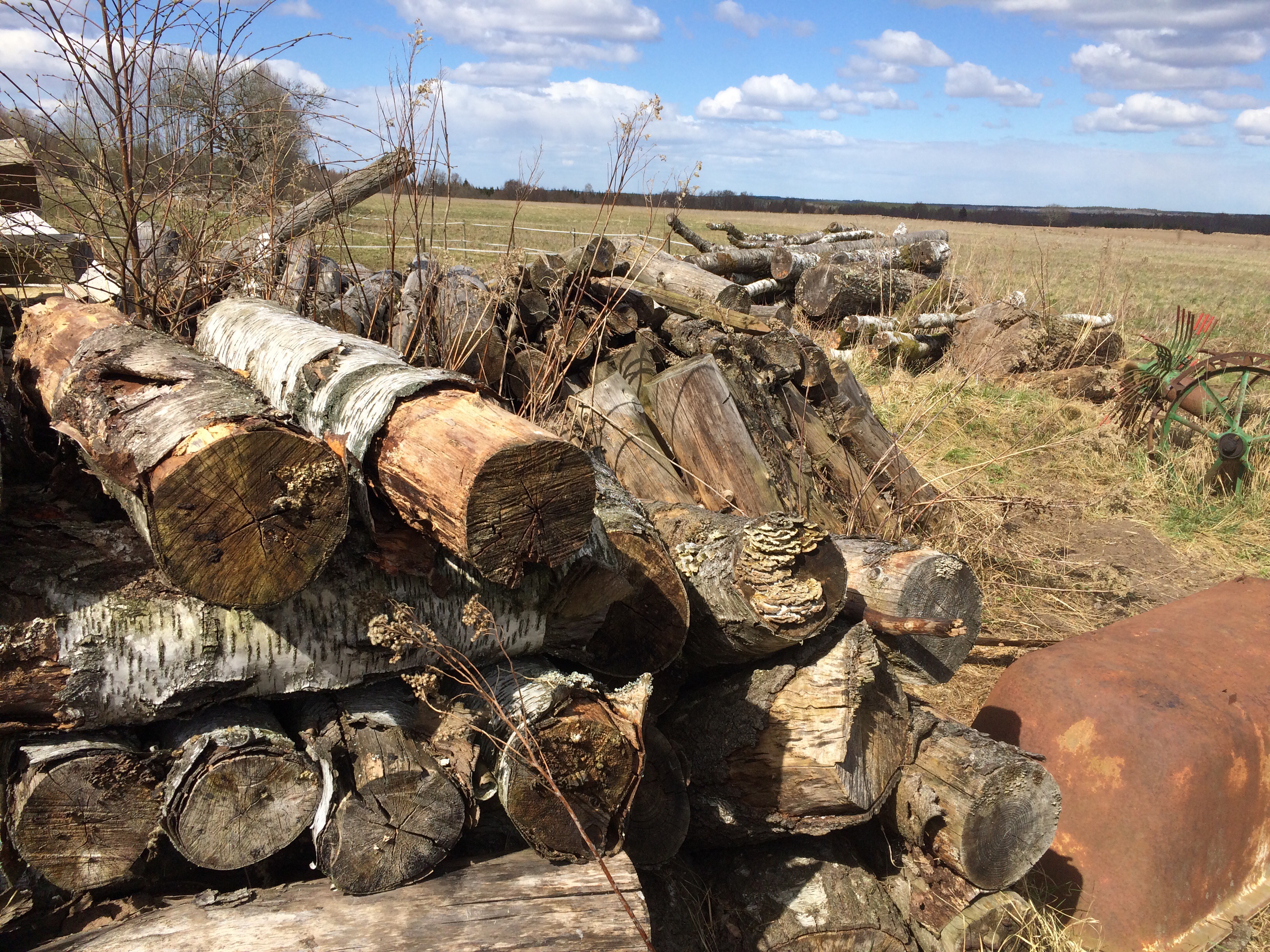 Efter detta tog vi fram traktorn och kärran och fortsatte med de meterlånga trädstammarna som samma säljare samlat på hög bredvid skrothögen. Vi lastade stammarna på kärran och körde ut till Pers flishög ute i skogen där vi fick lov att lägga de halvruttna stammarna. Det blev fyra fulla lass och det tog faktiskt resten av dagen.