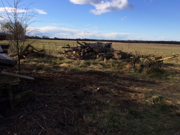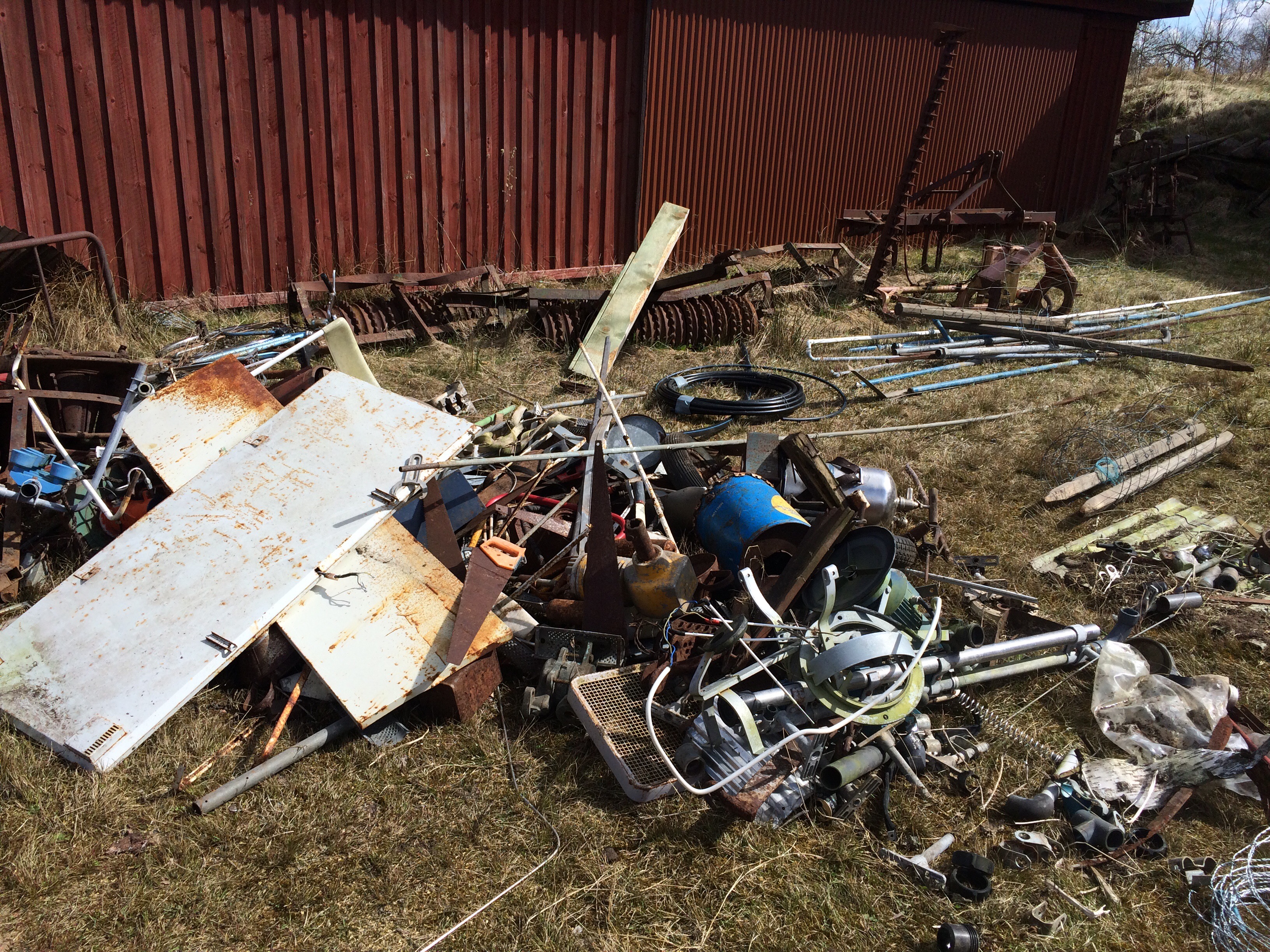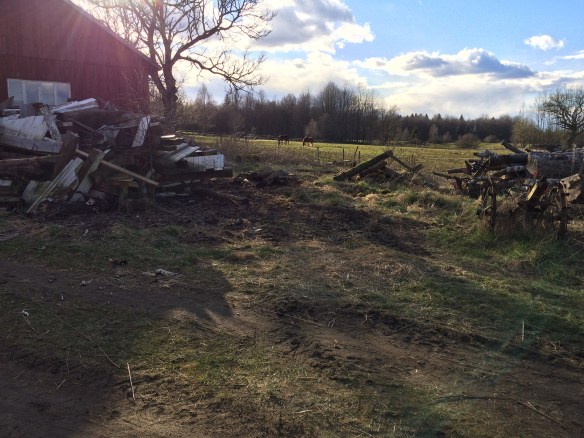 Puh idag har vi arbetat hårt jag och Axel. Vi började dagen med att dra ut allt skrot som tidigare ägare till gården lagt på en hög bakom stallet. Denna hög har med tiden blivit ganska övervuxen av diverse växter så vi passade på nu innan växtsäsongen drar igång på riktigt. Det allra allra mesta ska skrotas men en del av det kan nog användas till nåt. Får se när vi får tillfälle att sortera och köra iväg med skiten, nu är den lättillgänglig i alla fall.