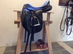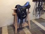 Tanken är alltså att man kan hänga sin sadel här när man vill smörja den och det är också smidigare att byta schabrak när sadeln hänger lite mer fritt så här jämfört med när den hänger på hängaren på väggen. Det är en liten hylla längst ner också där man kan ha sin sadeltvål och sitt läderbalsam! Alltid bra att underlätta och göra det roligare att hålla sina grejer rena och välsmorda! Jag borde få upp min ”putskrok” i taket också, så man kan smörja tränset enkelt när man ändå håller på.