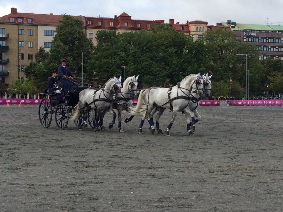 Ännu en dag till ända, och en lite småregnig sådan, åtminstone nu på kvällskvisten. Axel har varit i Norra Kärr över dagen och kommer hem först vid tiotiden ikväll så jag har tillbringat lite extra tid i stallet. Först trotsade jag och Kaprifol regnet (även om det knappt regnade precis när vi gick ut faktiskt) och jag tömkörde henne lite på banan. Hon var superfin i traven i båda varven och var väldigt lyhörd och kanske lite väl ”elektrisk” i mellanåt. Jag försökte låta henne trava över lite bommar men jag lyckades inte alls vara så följsam som jag behövde vara så jag gav upp det ganska snabbt. Det går bra att tömköra så länge jag står relativt still, eller går efter henne i ganska långsam skritt, men jag har svårt att röra mig fortare än så vilket jag hade behövt för att få till styrningen och följsamheten över bommarna.
