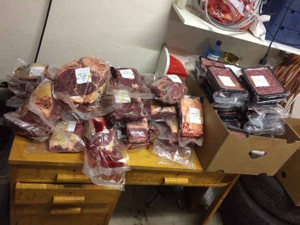 Till sist fick de med sig sin köttlåda också. Jag och Axel köpte nämligen 70kg nötkött från samma ställe som vi köpte lammköttet ifrån och delade det med mina systrars familjer. Vi har fått starta upp frysen i källaren också och kan äta goda och glada köttbitar i flera år känns det som. Det kommer ju fyllas på med vår egen gris så småningom och kanske blir det nåt mer viltkött i samband med jakten nästa vecka!