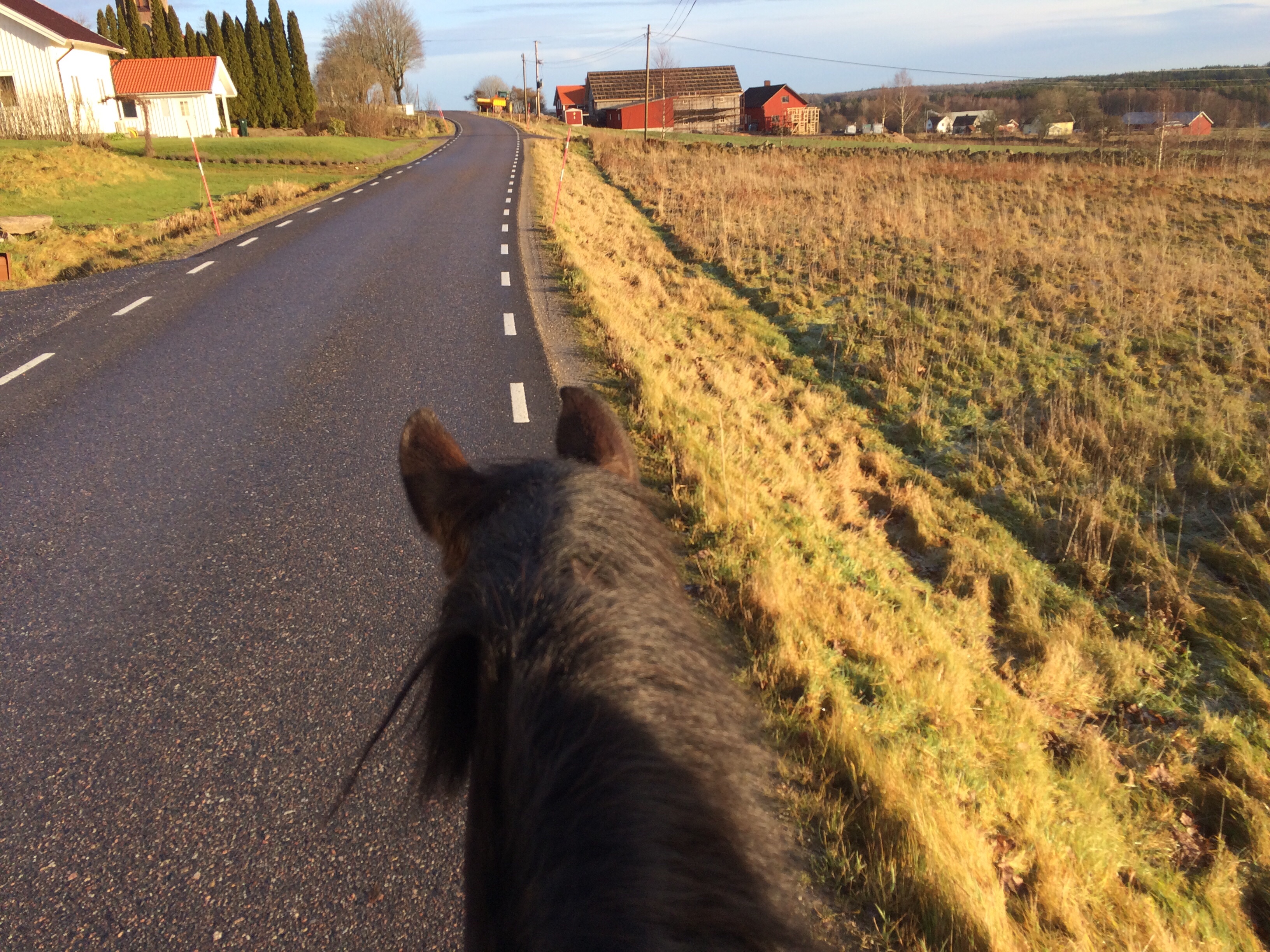 Vi red förbi ridhuset och in på Backvägen, en runda på 7km som tog strax under en timme. Det var hur härligt som helst verkligen, en hel del trav och ett par galopper fick vi in också.