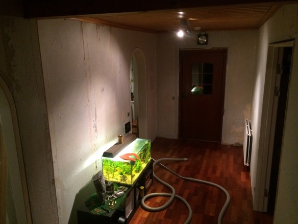 Det blir ju ett lite större projekt jämfört med övervåningen. Vi ska nämligen bredda dörröppningen mellan hallen och vardagsrummet (så de fina dörrarna försvinner tyvärr) vilket ju innebär lite rivning i väggen. Eftersom vi inte vill byta ut golvet måste vi även få loss lite golv nånstans ifrån så vi kan fylla ”hålet” under den borttagna väggen (typ en bräda). Vi kommer lösa det antigen genom att lägga sten där vi vill ha vår kamin, alternativt lägga lite stenplattor innanför ytterdörren i hallen. Eller kanske både och? Får se.