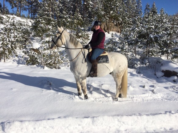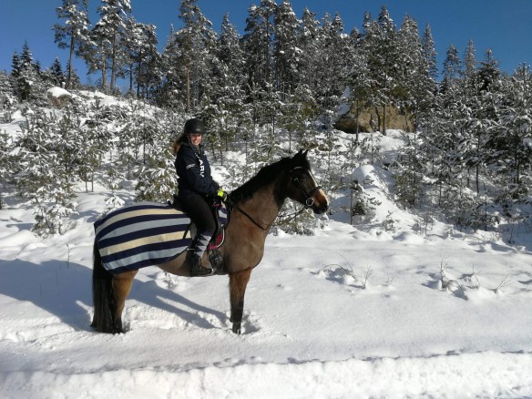 Oj vad roligt att komma igång och träna igen! Jag red hemifrån strax efter fyra och det tog som jag trodde ca 20 minuter att rida till ridhuset. Kaprifol var som ett popcorn och poppade för det mesta på vägen dit; snöhögar, barmark, en fladdrande plast, snö som blåste över vägen… Ja ni får in känslan va? Solen sken, vinden ven, snön yrde och det var ca tio minusgrader. Men vi tog oss fram till ridhuset där jag hoppade av och ridhusinnehavaren mötte mig vid stallet och visade mig vägen runt till ridhuset. Kaprifol var en decimeter högre än vanligt och på helspänn när vi kom in i ridhuset, hon tyckte det var SÅ konstigt att vår uteritt plötsligt landade inomhus. Jag gick runt med henne ett tag och försökte få henne att tagga ner lite men hoppade sen upp för jag tänkte att det är lika bra att sätta igång och röra lite på henne så lugnar hon sig nog. Det gjorde hon dock inte utan flög i luften för alla okända ljud (det knäppte lite i taket, vinden lät, och det skapade lite ibland). För att inte förstöra träningen helt för Linnea och Calle som var innan mig hoppade jag av igen och gick lite och ställde mig sedan i mitten av ena volten och där lugnade hon sig lite faktiskt och slappnade av lite.