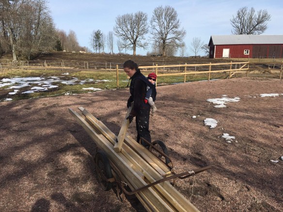 Det är i alla fall en solig men lite blåsig dag. Vi har under förmiddagen satt tillbaka paddockstaketet och under resten av dagen blir det eventuellt lite handling och fix av hängrännorna som åkte med snön ner.