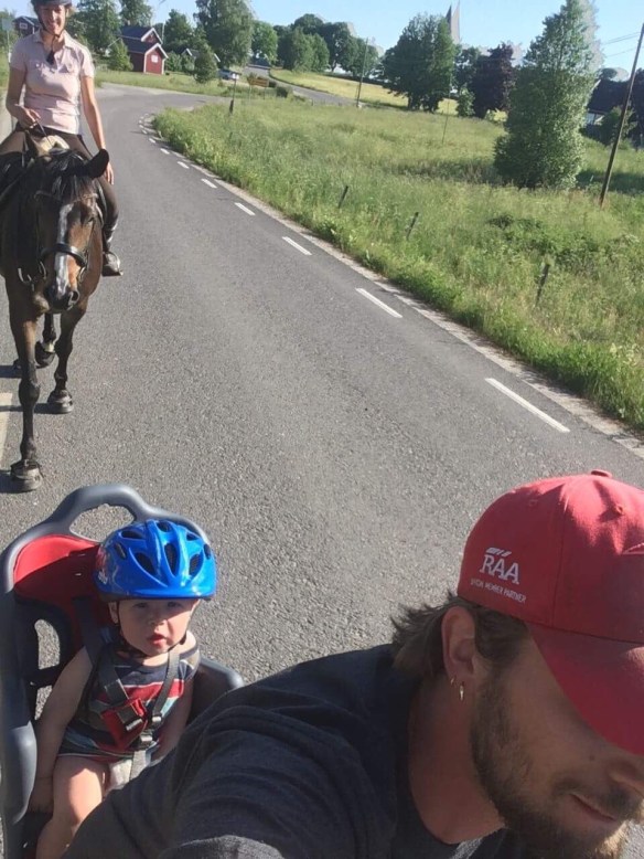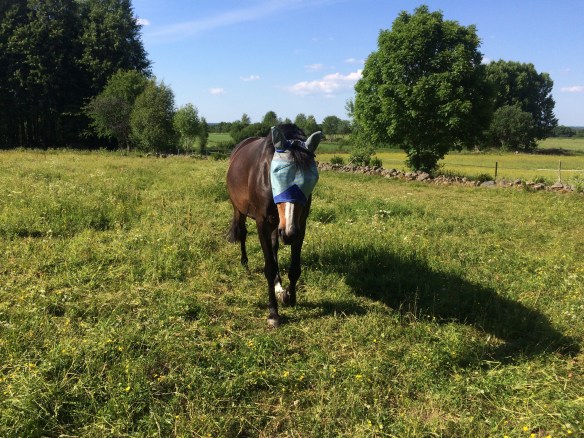 På skoj testade jag att rida ett dressyrprogram i slutet av passet, jag kan inte riktigt nåt program helt utantill just nu men jag vet ju på ett ungefär vilka delar som är med så det blev nog nästan rätt i alla fall. Det dök upp en heeeel del grejer jag behöver träna mer på, helt klart. Bara såna saker att vissa grejer ska ske på en viss plats är ju lite knepigt ibland, och jag behöver bli bättre på att utnyttja hörnen och vägarna på ridbanan för att behålla formen och för att få mer tid att förbereda. Halterna gjorde vi faktiskt bra, det har varit ett av våra ”problem” tidigare men det har vi kommit över. Igångsättning i trav lite segare dock. Sen är det ju det här med att sitta ner i traven mer än ett varv på volten i taget, ah! Får sätta alarm på mobilen och göra situps två gånger om dan tror jag… Nåja övning ger väl färdighet hoppas jag.