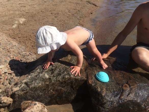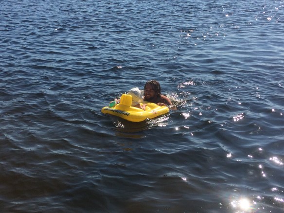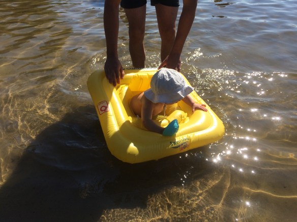 Vi provade den här baby-sim-grejen som vi fått av nån av systrarna i sjön och den var uppskattad. Den funkade ju lite som en gåstol i vattnet plus att han kunde hänga med ut och simma.