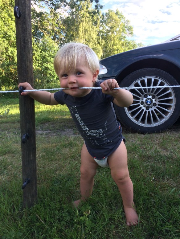 Idag la vi lite tid borta vid tennisbanan efter middagen. Om ni minns gick ju fåren där och betade för ett par veckor sedan och det håller på att växa upp igen faktiskt. Vår plan är därför att släppa dit lammen + baggen när det är dags för avvänjning om en månad ungefär. Lammen ska vänjas av så tackorna kan sluta ge di och få lite återhämtning innan det är dags för betäckning senare i år. Vi tror att vi bara fått tack-lamm i år, annars är ju en annan anledning för avvänjning att bagglammen inte ska betäcka sina mammor. Baggen får hänga med lammen som ”barnvakt” och för att vi ska kunna bestämma lite när det är dags för betäckning. Gotlandstackor brunstar bara på hösten, men vi vill gärna inte ha de nya lammen för tidigt, därför håller vi undan baggen till All Helgona-helgen ungefär.