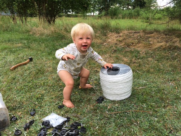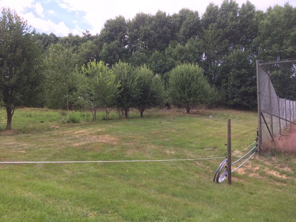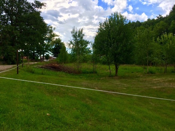 Vi har nu satt alla stolp och isolatorer och en rad med tråd. Det som saknas är ytterligare tre rader med tråd; en med vit vanlig stängseltråd och två aluminium längst ner. Eventuellt sätter vi två stolpar till inne bland träden, där blev det kanske lite glest. Längs den långsidan växer det massa sly/mindre träd som ska tas ner så där har vi skruvat isolatorerna direkt i träden tills vidare.