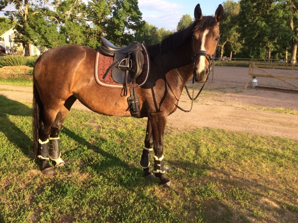 I förmiddags stoppade vi in Kaprifol i släpet och åkte de dryga två milen till Sandris Häst och Utrustning och deras nybyggda terrängbana. Det första Kaprifol fick se när vi lastade av var en flock kor, hehe. De kom smygandes närmare och närmare och Kaprifol gjorde stora ögon, men höll sig i skinnet. Lyckligtvis kunde de inte gå ändra fram till terrängbanan så jag behövde inte bekymra mig så mycket om det. Banan låg på en inhängnad gräsplätt och det fanns flertalet hinder, även ett par vanliga banhoppningshinder fanns det. Mestadels platt men en liten kulle fanns det, det gillas 🙂