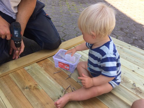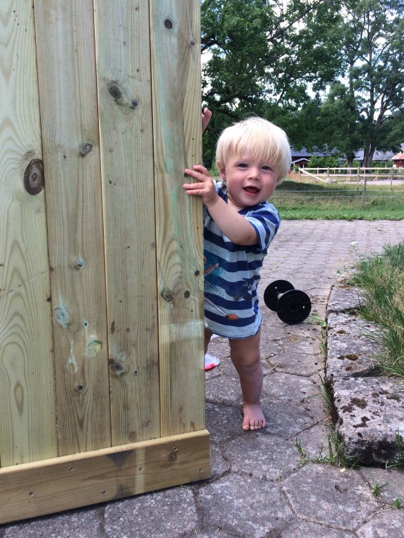 Vi började arbeta vid halv fyra ungefär och runt sjutiden var vi helt klara! Hej vad snabbt det går när man är flera! Loke var med en stund och kravlade runt i gräset, satt i vagnen och klättrade på kärran. Sen fick han sitta i ryggsäcksselen på Axels rygg medan han skruvade isolatorer och då dröjde det inte lång stund innan han somnade så då lyfte vi över honom i vagnen och så sov han tills vi nästan var klara. Smidigt!
