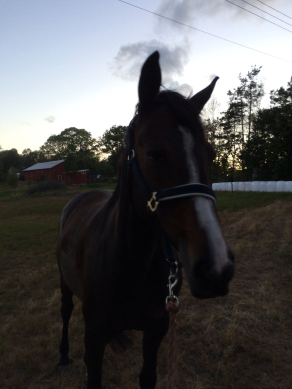 Som ni vet har hästarna nu betat på gärdena i skogen i två veckor, jag är väldigt glad över att de kunde gå där så pass länge och väldigt tacksam för att vi fick beta där! Nu är gräset dock slut där ute och vi flyttade hem hästarna till gården igår. I hagen som nu har vilat i en och en halv månad finns det ungefär fem grässtrån. Den är till största delen helt sönderbränd av solen. Vi kikade på hagen innan vi släppte hästarna i skogen och då fanns det ändå en del gräs så vi tänkte att det skulle bli perfekt med ytterligare två veckors vila, men det gräset som fanns då är helt förtorkat. Jag ska fota hagen nån dag så ska ni få se. Den andra sommarhagen ser inte mycket bättre ut, vinterhagen är fortfarande lite grön men det finns inget bete, och halva hagen vid huset är också ganska förtorkad. Den nedre delen är dock fin, där det i vanliga fall är sumpmark, så där växer det lite gräs.