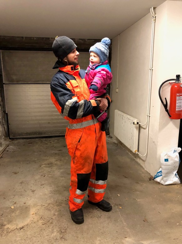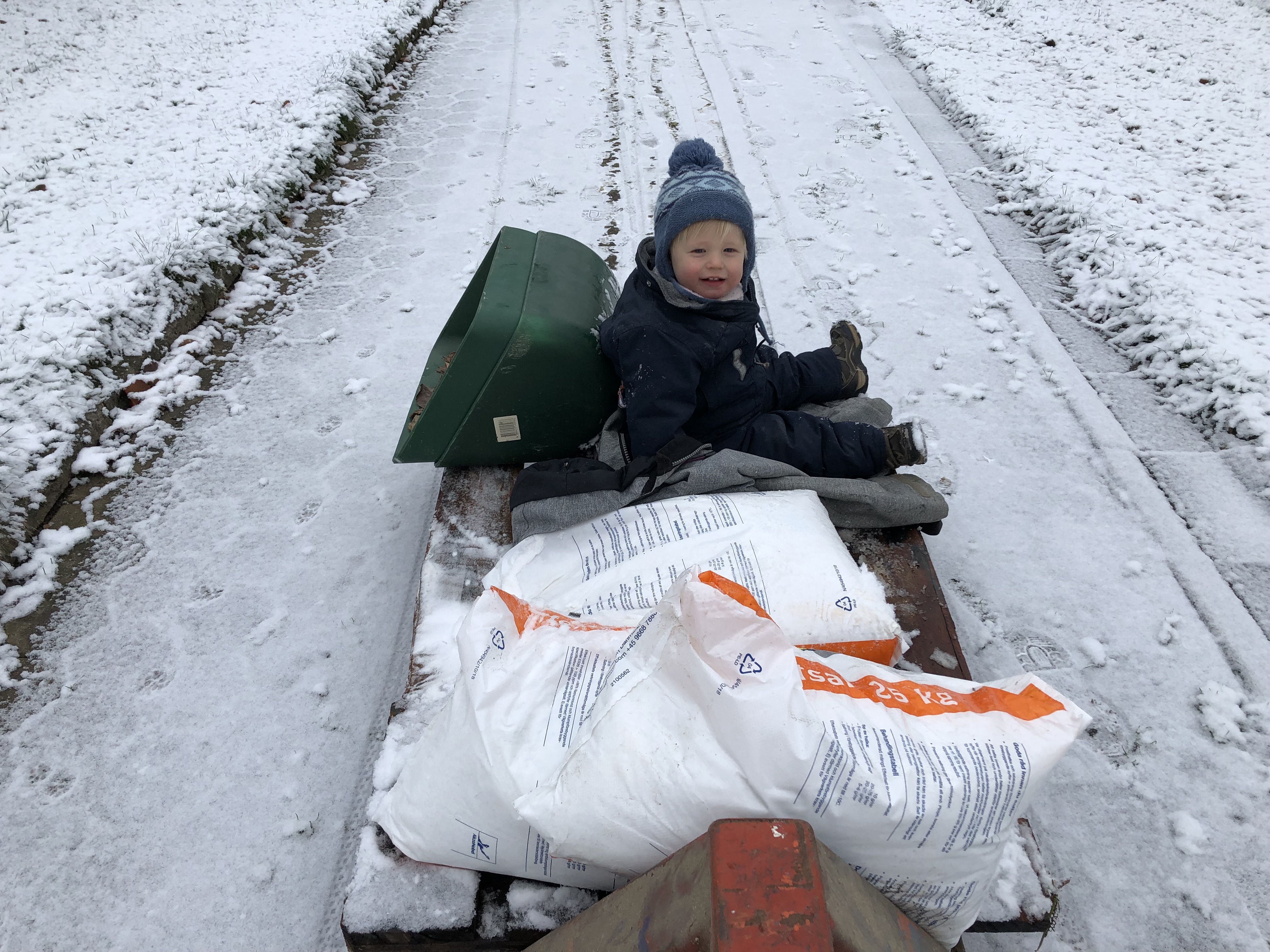 Nu är det allt lite kyligt! När vi åkte hem från Enbergs i söndags kväll funderade jag lite på hur utbudet på vinterkläder i Lokes storlek såg ut hemma bland arvegodset, hans jacka börjar dessutom bli lite liten så det var dags att kika lite efter en större. Och jag behövde såklart inte bli besviken, i nästa storlekslåda fanns det både jacka och overall. Jackan är nog lite stor kanske men overallen passade riktigt bra. Han fick inviga den under dagen igår och Axel rapporterade med bild.