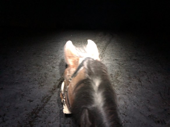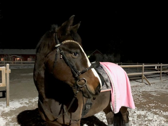 Efter Lokes läggdags gick jag ut till stallet och Kaprifol för lite ridning. Ridbanan har klarat kylan bra och var ridbar trots ca 7 minusgrader, jag och Kaprifol höll oss dock till skogen. Snön gnistrade vackert i pannlampans sken och det var bara det dova ljudet av hovar mot snötäckt gräs som hördes.